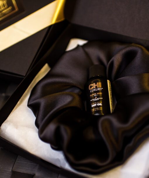Rinkinyje supakuota viena pasirinktos spalvos šilko gumelė ir viena CHI plaukų priežiūros priemonė.