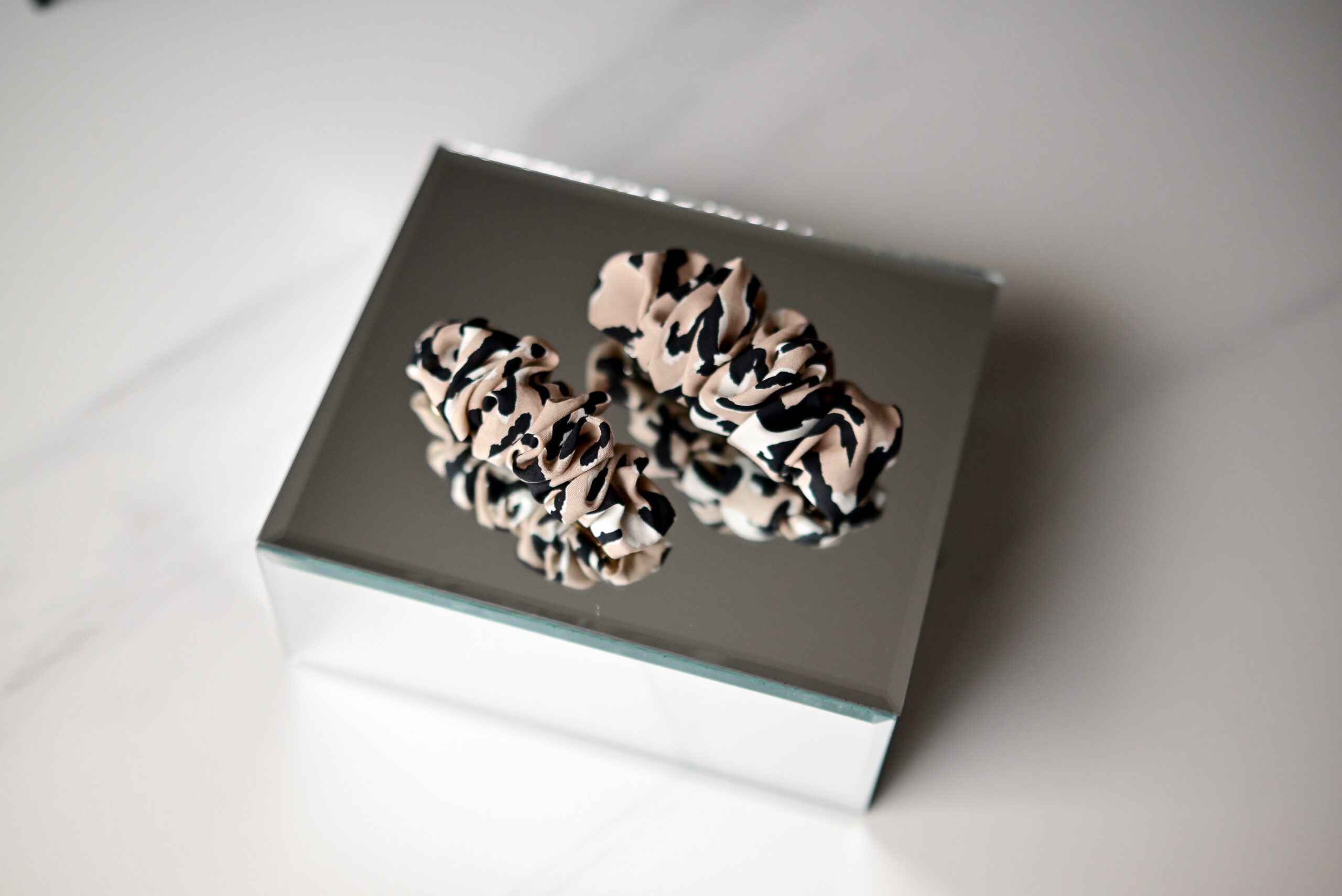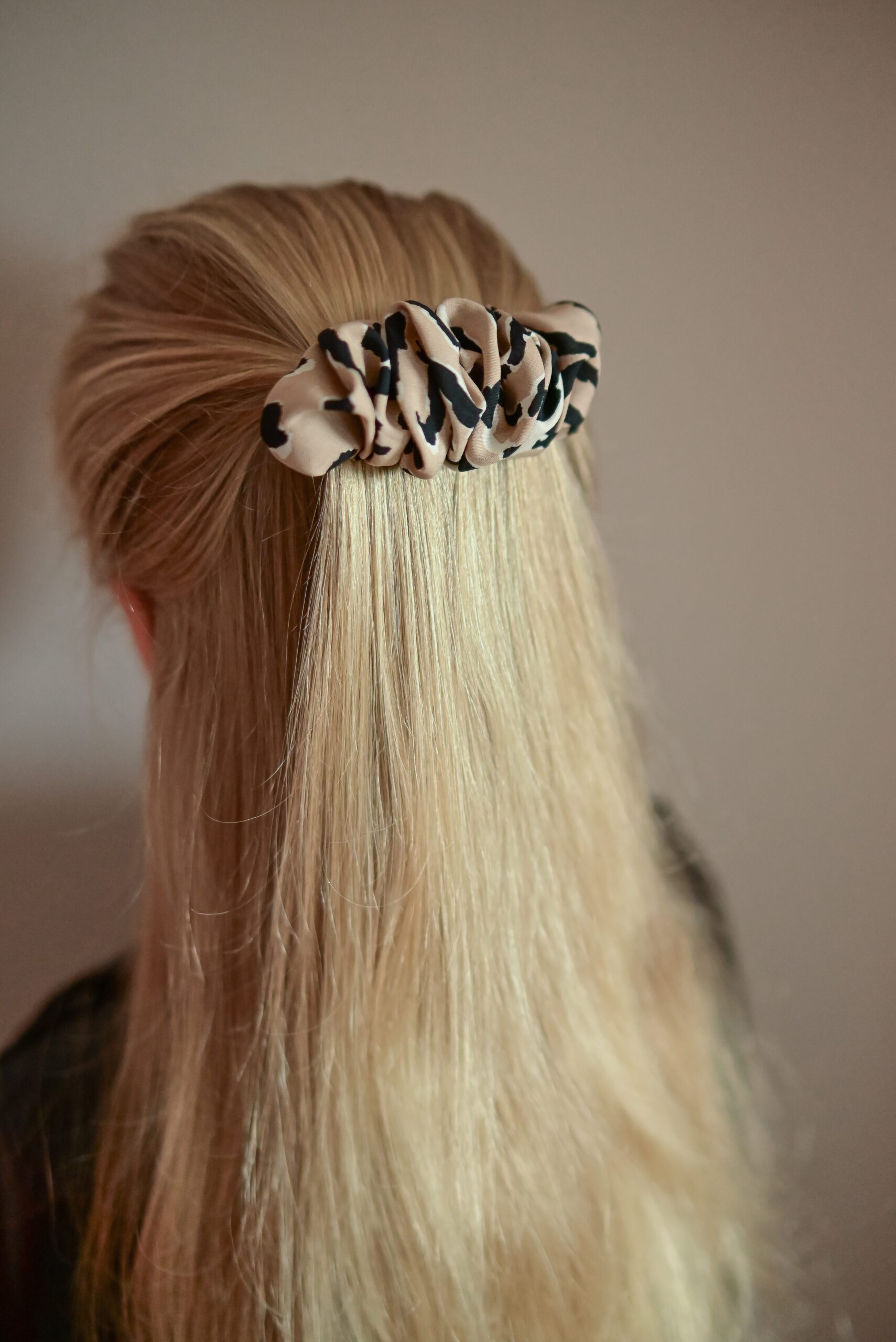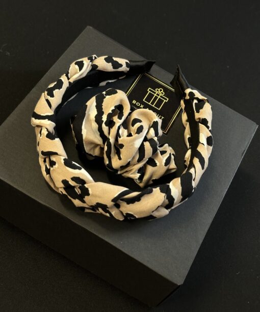 Gyvūnų raštų segtukas plaukams- „kruasanas“. Rauktas, plonesnio audinio segtukas skirtas plonesniems plaukams segti arba daliai plaukų.