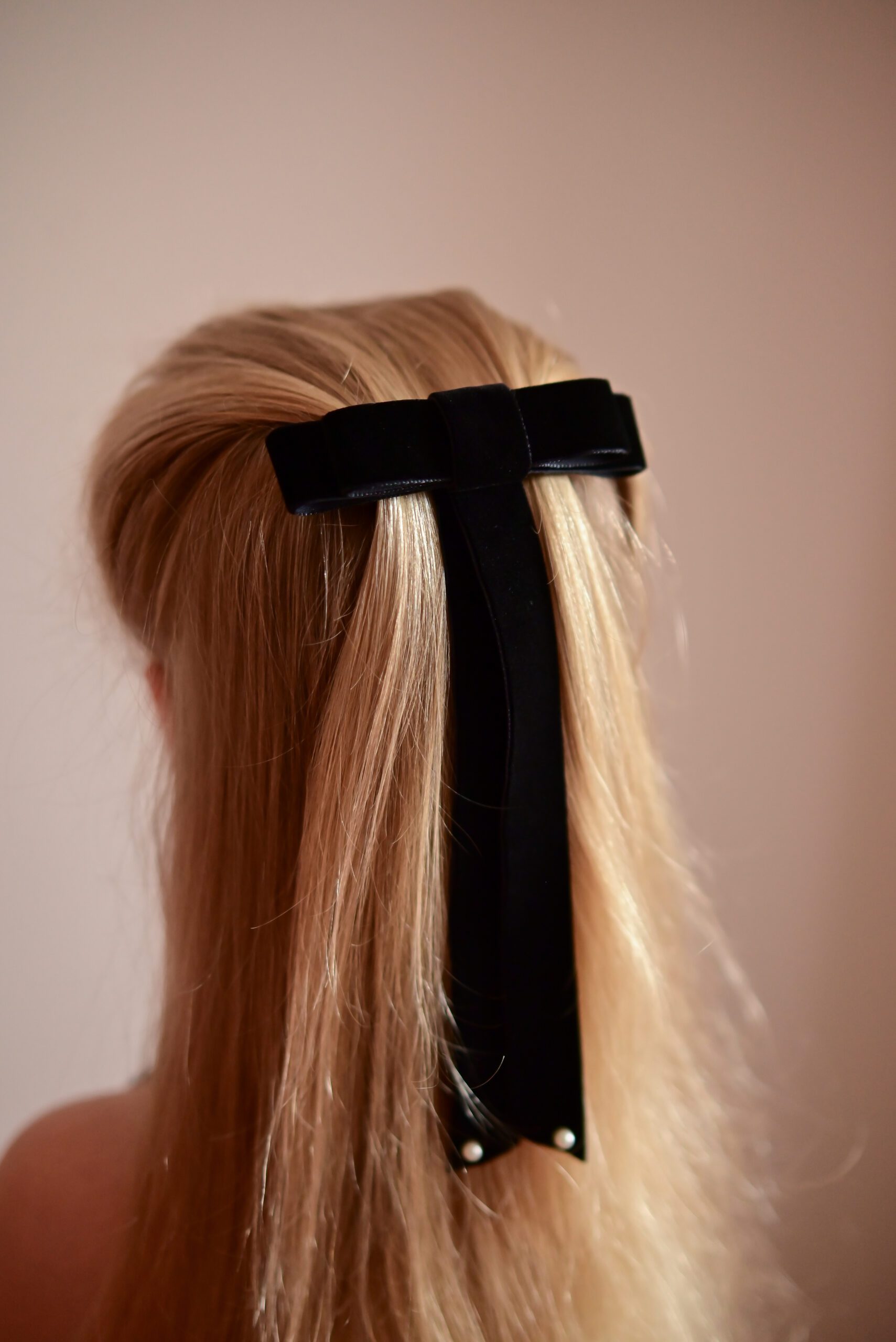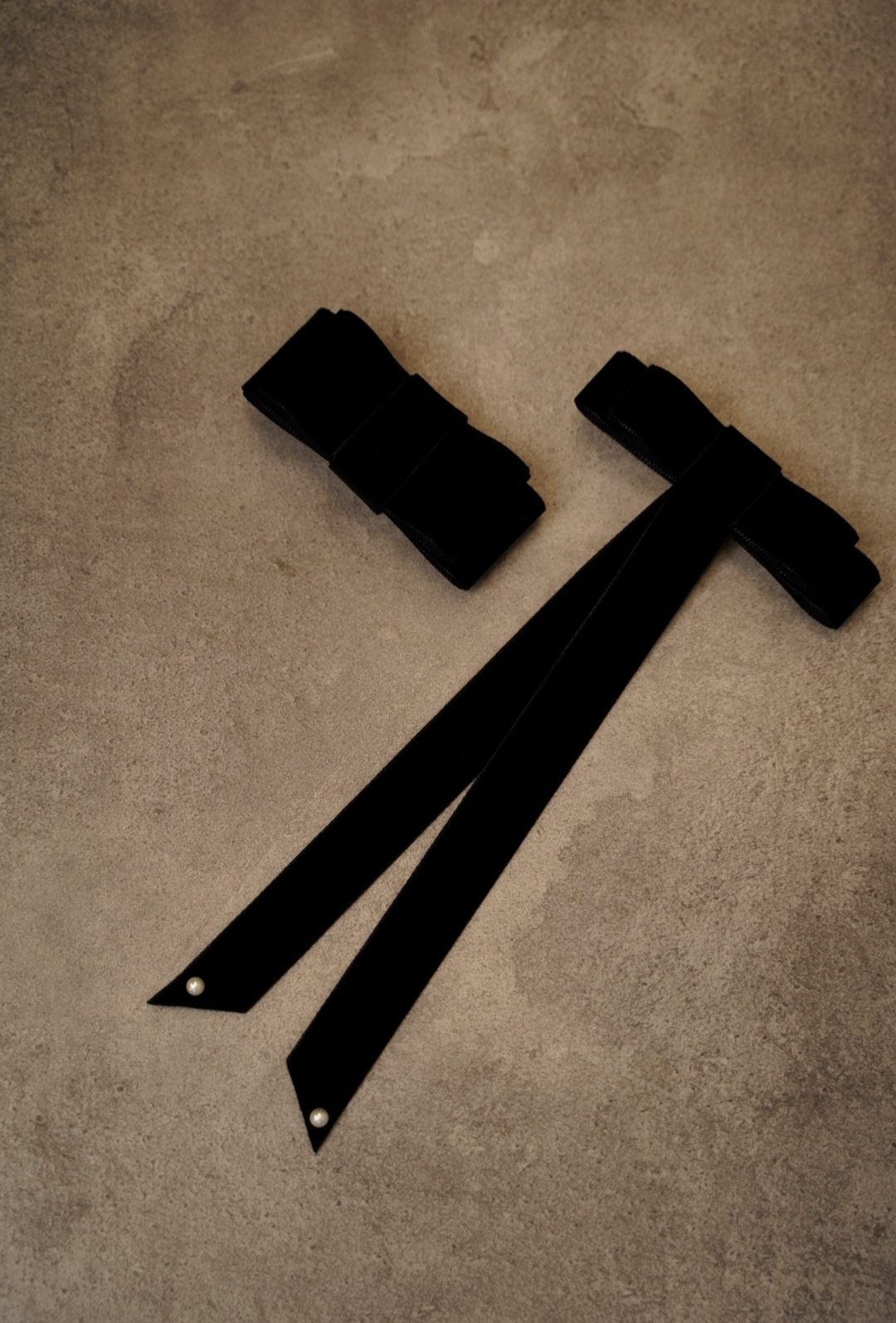 Plaukų segtukas kaspinėlis su „uodegėlėlmis“ ir baltais perliukais. Klasikinio modelio, aksominis, juodos spalvos elegantiška puošmena plaukuose.