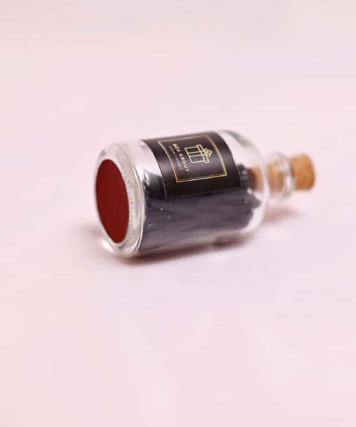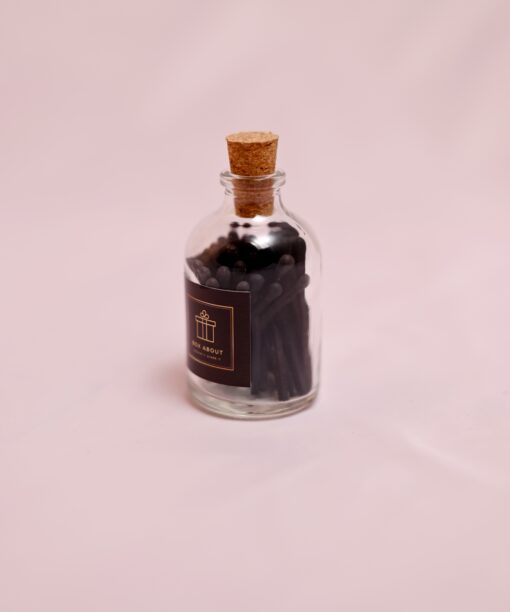 „Box About” degtukai gali tapti stilingu namų aksesuaru! Juodos spalvos degtukai supakuoti gražaus dizaino stikliniame buteliuke. Ant buteliuko dugno priklijuota sieros juostelė leidžia lengvai ir stilingai įžiebti degtukus. Buteliukas užkimštas kamštiniu kaiščiu, todėl jį lengva atidaryti ir vėl uždaryti.